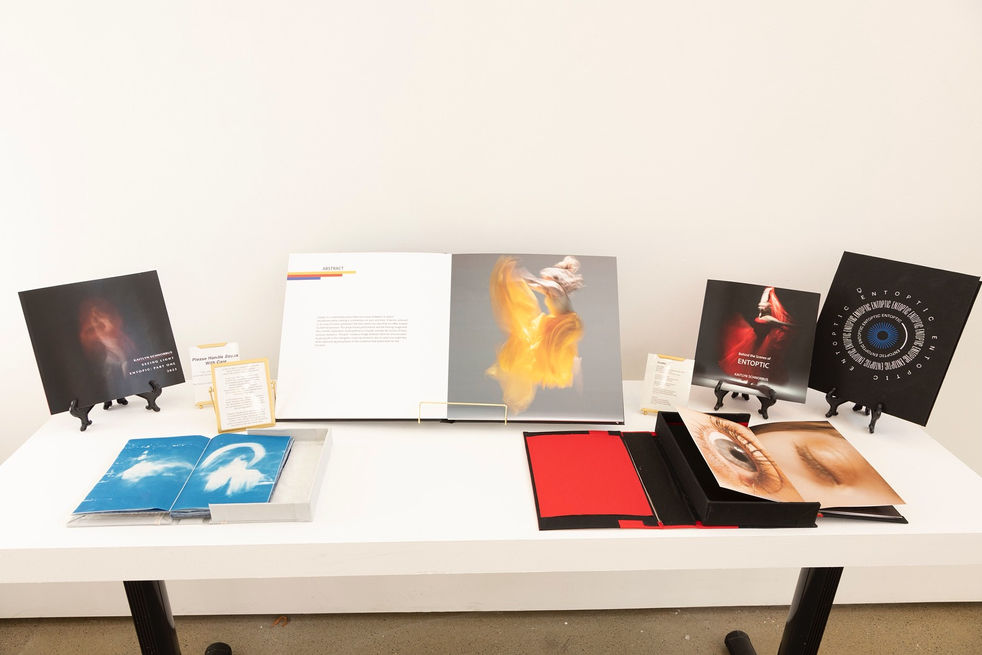 In the fall of 2024 I displayed the entire body of work relating to Entoptic in a combination CARAS Grant and BFA Exhibition in Tyler School of Art & Architecture's Stella Elkins Gallery. This display features a table of books, large scale adhesive and fabric based prints, lighting and projection elements, and a viewing structure that featured the video created on a loop.